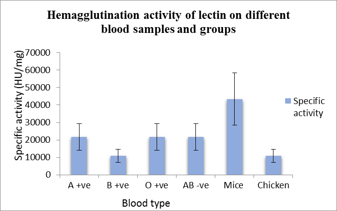 The lectin sample could agglutinate all the blood types tested, but more specific activity was obtained with mice erythrocytes. (fig. 5b).