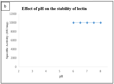 In order to study the effect of pH, buffers of varying pH values 6.0, 6.5, 7.0, 7.5, and 8.0 were prepared. 20 µl each of the buffer was mixed with an equal volume of lectin sample in PBS. The samples were incubated overnight and the hemagglutination assay was performed.