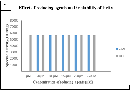 Role of reducing agents was studied by incubating 15 µl of lectin sample in the reducing agents, 2-Mercaptoethanol-(2-ME) and Dithiothreitol-(DTT), at concentrations 50µM, 100 µM, 150 µM, 200 µM, and 250 µM and hemagglutination activity were assessed.
