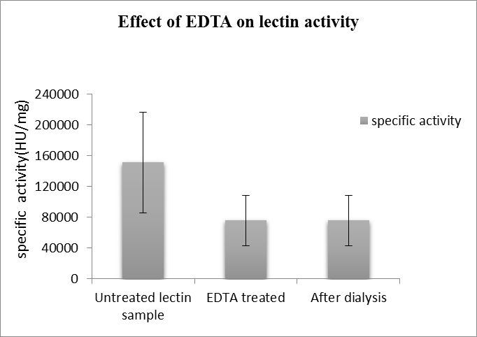 The purified lectin was stable in the temperature range-20 °C to 60 °C but the activity decreased drastically at higher temperatures. Lectin also maintained the hemagglutination property in the selected pH range. The reducing agent's 2-beta-mercaptoethanol (2-ME) and dithiothreitol (DTT) neither improved nor decreased the hemagglutination activity of lectin. Overnight treatment of the lectin with 100 mmol EDTA at 4 °C lowered the specific activity by half, but the removal of EDTA through dialysis could not restore its activity (fig. 6).