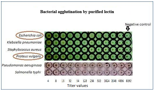Both Gram-positive and Gram-negative species (Staphylococcus aureus, Escherichia coli, Klebsiella pneumonia, Proteus vulgaris, Pseudomonas aeruginosa, Salmonella typhi) were tested for its ability to get agglutinated in the presence of the purified lectin. After careful observation, it was inferred that only the Gram-negative Escherichia coli and Proteus vulgaris were positive for agglutination.