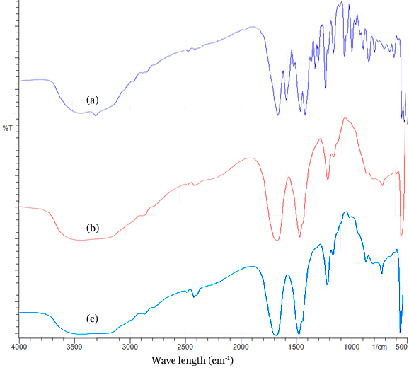 Fig.2: FTIR spectra analysis of pure Nimesulide (a), Nimesulide loaded blend hydrogelsbeads (b) andplacebo blend hydrogel beads (c) (Results are expressed as mean, n=3)