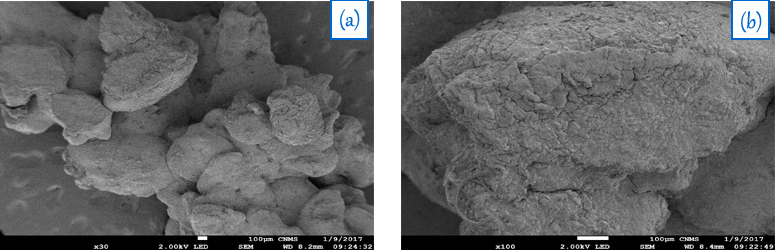 Fig.4:SEM micrographs of drug loaded IPN hydrogel beads (a) and (b) (Results are expressed as mean, n=3)