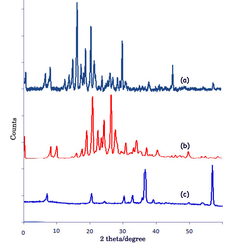 Fig.5: X-RD patterns of pure Nimesulide (a), Nimesulide loaded IPN hydrogelsbeads (b) and placebo IPNhydrogel beads (c) (Results are expressed as mean, n=3)