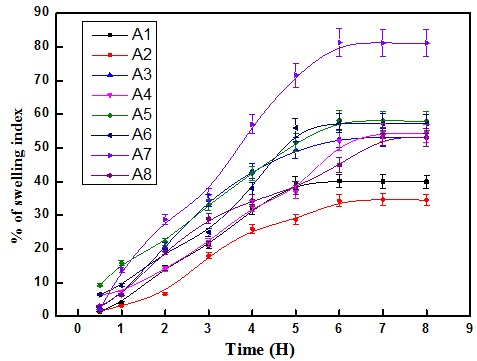 The swelling index for the various formulations is shown in (fig. 6). These profiles indicate the uptake of water into the hydrogel beads producing an increase in weight. The swelling ratio increased with increasing NaAlg content due to its hydrophilicity. In the case of crosslinker variations, the swelling ratios of hydrogel beads increased, with increasing amount of NaAlg, which enhanced the diffusion of water molecules into the hydrogel beads. The decrease in swelling with decreasing crosslinker was attributed to polymeric chains that become rigid due to the contraction of microvoids. The presence of Nimesulide embedded in the hydrogel caused enlargement of the hydrogel networks. A considerable variation in the swelling capacity was observed when the hydrogel beads were modified or loaded with Nimesulide.The overall results suggested that the dried beads swelled slightly in the acidic medium. When they were subsequently transferred to alkaline medium a thick diffusion layer surrounding the particles was formed, thereby sustaining the release of theincorporated drug.