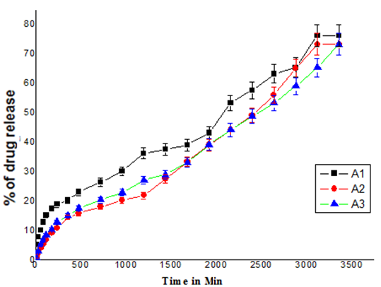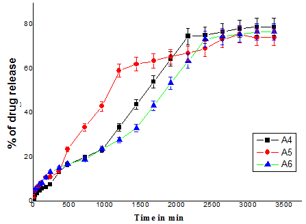 The effect of percentage drug loading on in vitro release for differentformulations is displayed in (fig. 7). To study the effect of drug loading on release rates, we have taken the formulations (A4, A5, and A6 with respect to drug loading of 5%, 10%, 15%), wherein A6 shows higher drug release than A5 and A4. This indicates that release rates vary depending upon the amount of drug present in the matrices. During the first 2h, burst release is observed for all formulations and observed that drug release rates almost same after that the release of drug was extended up to 48 h. Whereas A6 shows around 80% of drug release, A5 and A4 shows around-76% of drug release. A similar observation was reported by Patil and Bhoskar[34] from their drug release studies.