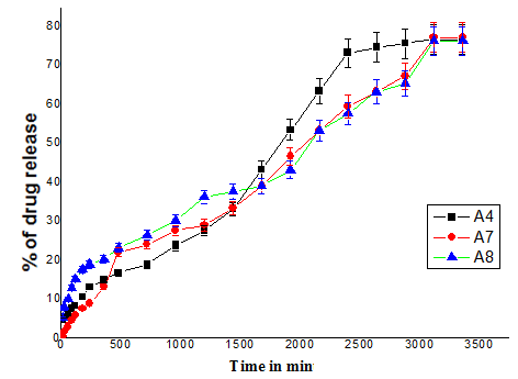 Fig.8: % of cumulative release of Nimesulide through hydrogel beads containing different amounts of crosslinker formulationsA7 (1 ml), A4 (1.5 ml) and A8(2 ml)in pH7.4 solution (Results are expressed as mean, n=3)