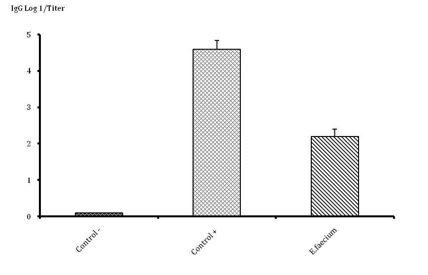 Titers were calculated as the log (1/Titer) and are expressed as the mean of ten mice ± SE for each group. The statistical significance of comparisons between the Enterococcus feacium-fed groups and saline-fed groups (control+) was assessed by using Student t test