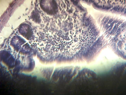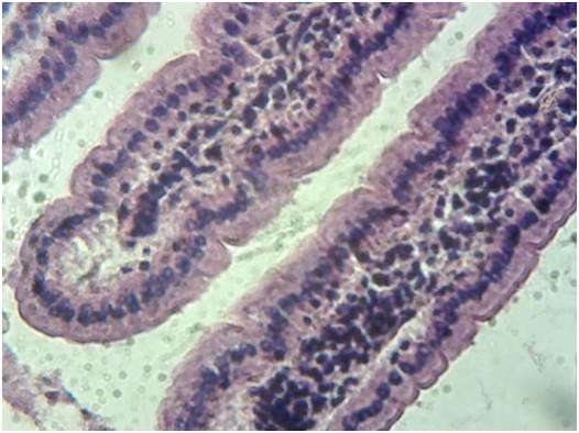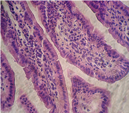 Intestinal morphology was examined by light microscopy. The morphological appearance of the intestinal mucosa section in the negative control (control-) group, gave long thin villi with an unistratified epithelium (Fig. 2a). In contrast, the villi of the positive control (control+) group was shorter with marked alteration. Histologic examination showed separation of the epithelium cell layer from the laminapropria. At the level of the chorion, inflammatory infiltration was extremely marked (Fig. 2b). We could distinguish, in the group that ingested Enterococcus faecium PC4.1, long and fine villi that were in small abundance and which corresponded to the cells of the immune system, i.e. lymphocytes (Fig. 2c).