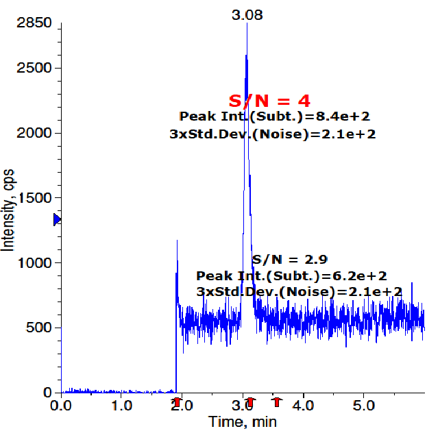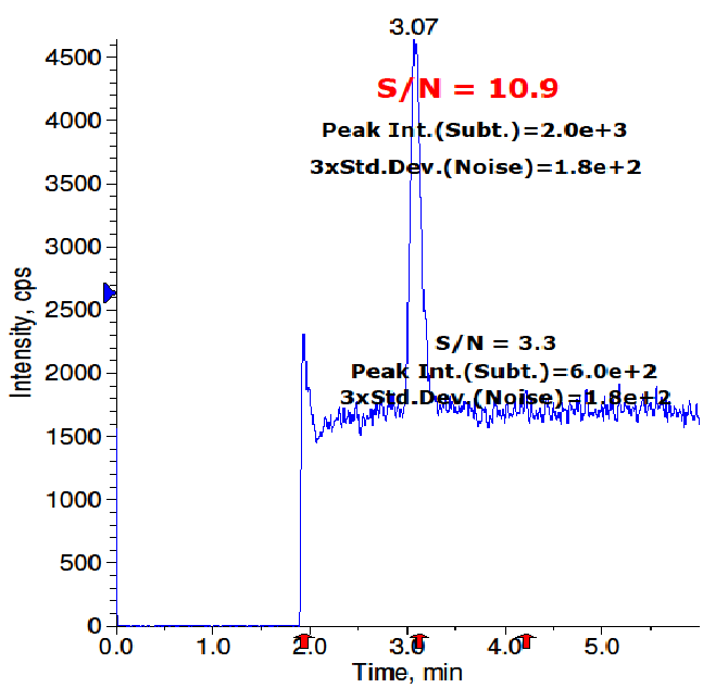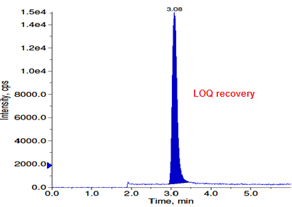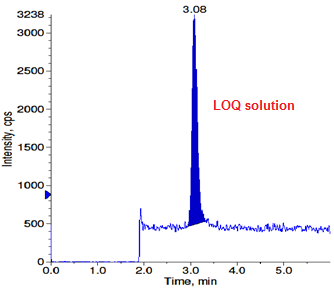 The LOD and LOQ were calculated from S/N (signal to noise) ratio. To determine LOD and LOQ values of BOC epoxide, the concentrations were reduced consecutively. The S/N ratio for LOD and LOQ for BOC epoxide was found to be 4 and 10.9 respectively. The determined LOD and LOQ were shown in fig. 5 and 6.