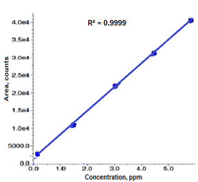 Fig. 7: Correlation coefficient and linearity 0.5 ppm to 6.0 ppm (LOQ solution, L1 solution, L2 solution, L3 solution and L4 solution)