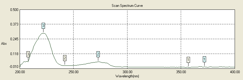 Stock solution 100µg/ml of Metoprolol succinate was prepared in 0.1N Hcl solution. This solution was approximately diluted with 0.1N Hcl to obtain a concentration of 10µg/ml. The resultant solution was scanned in range of 200- 400nm using UV double beam spectrophotometer (Lab India UV-3000+).