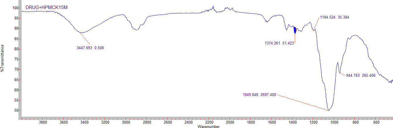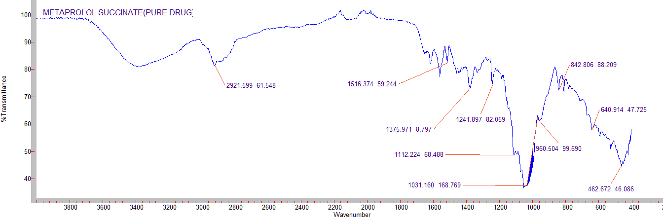 In the preparation of SR tablet, drug and polymer may interact as they are in close contact with each other, which could lead to instability of drug. Preformulation studies regarding drug-polymer interactions are therefore very critical in selecting appropriate polymers. FT-IR spectroscopy (Agilent Technologies) was employed to ascertain the compatibility between Metoprolol succinate and selected polymers. The individual drug and drug with excipients were scanned separately.