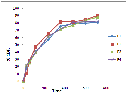 Fig. 7: Dissolution graphs of F1, F2, F3, F4 Formulations