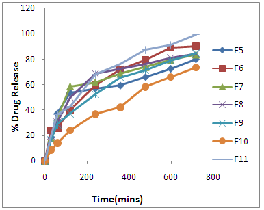 Fig. 8: Dissolution graphs of F5, F6, F7, F8, F9, F10, F11 Formulations