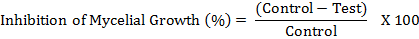 Where control and test denotes the colony diameter of test fungi on control and poisoned plates respectively [25].