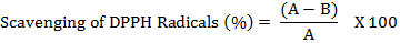 Where ‘A’ and ‘B’ denotes the absorbance of DPPH control and absorbance of DPPH in presence of extract/standard. The IC50 value was calculated. IC50 value represents the concentration of extract required to scavenge 50% of DPPH radicals [24].