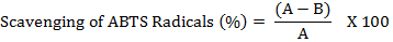 Where ‘A’ and ‘B’ represents the absorbance of ABTS control and absorbance of ABTS in presence of extract/standard. The IC50 value was calculated. IC50 value represents the concentration of extract required to scavenge 50% of ABTS radicals [24].