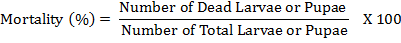 The insecticidal potential of leaf and fruit extracts in terms of larvicidal and pupicidal activity was assessed against A. aegypti. In brief, 20 larvae (II and IV instar) and pupae were transferred separately into conical flasks containing 50 ml of water (with different concentrations of extracts namely 0.0 to 2.0 mg/ml). The mortality of larvae and pupae (%) was assessed after 24 h and was calculated using the formula: