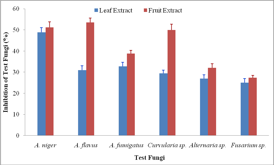 Fig. 1: Extent of inhibition of test fungi (%) by leaf and fruit extract