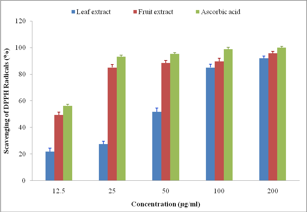 DPPH radical solution and different concentrations (12.5 to 200µg/ml) of leaf and fruit extracts and ascorbic acid (reference standard) were prepared in methanol. To each of the tubes containing 1 ml of different concentrations of leaf and fruit extracts and ascorbic acid, 3 ml of DPPH radical solution was added and the tubes were incubated in dark for 30 min. The absorbance was measured in a spectro-photometer at 517 nm. Extract replaced by methanol served as control. The radical scavenging potential of each concentration of extracts/ascorbic acid was determined using the formula: