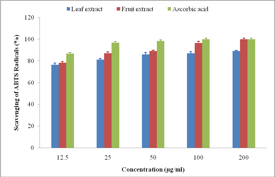ABTS radical was generated by mixing ABTS salt (7 mmol) with Potassium persulfate (2.45 mmol) and incubating for 16 h. The resulting radical solution was diluted with distilled water to an absorbance 0.7 in spectrophotometer. 1 ml of different concentrations (12.5 to 200µg/ml) of leaf and fruit extracts and ascorbic acid (reference standard) was mixed with 3 ml of ABTS radical solution and the tubes were incubated in dark for 30 min at room temperature. The absorbance of reaction mixture of each tube was measured in a spectrophotometer at 730 nm. Extract replaced by methanol served as control. The radical scavenging potential of each concentration of extracts/ascorbic acid was determined using the formula: