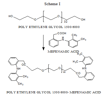PEG 1500/6000 1.5 gms and 1.6 ml of pyridine were taken in a round bottomed flask, to it a solution of DCC 1gm and 0.6 gms of DMAP in 10 ml DMF was added. The flask was kept in an ice bath and temperature was maintained 0o C, to this mefenamic acid was added for 10 mints. The flask was then placed on a magnetic stirrer, attached with a condenser and was allowed for coupling reaction for 7 days at room temperature. The residue obtained was dissolved in DCM (dichloro methane) and reprecipitated by excess of cold diethyl ether [25]. The product obtained was subjected to TLC (thin layer chromatography) using mobile phase DCM: methanol 3:2. Finally structure was confirmed (Scheme I) by FT-I.R and N.M.R.