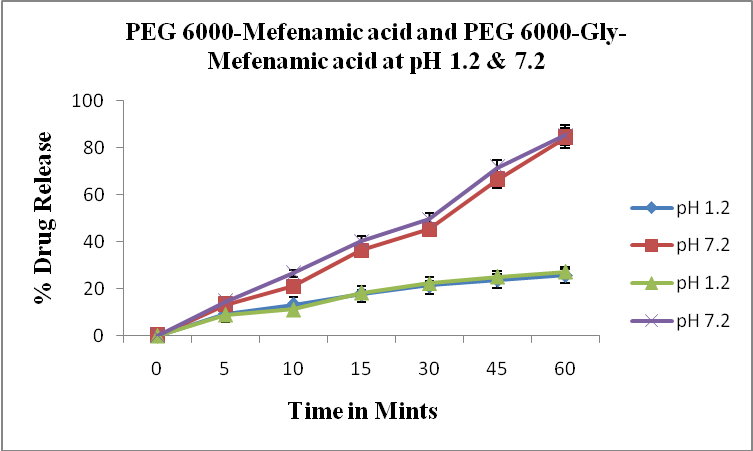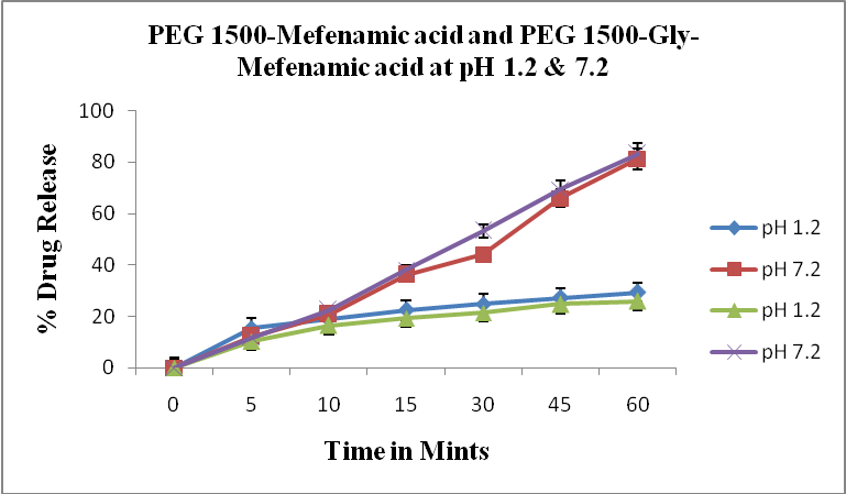 The drug release studies for the synthesized prodrugs were given in Fig.7 and Fig.8, the study revealed that drug release for PEG 1500-mefenamic acid, PEG 1500-glycine-mefenamic acid, PEG 6000-mefenamic acid and PEG 6000-glycine-mefenamic acid was more at pH 7.2 than at pH 1.2. Also the comparision study indicated that there is a role of spacer (glycine) in the drug release.