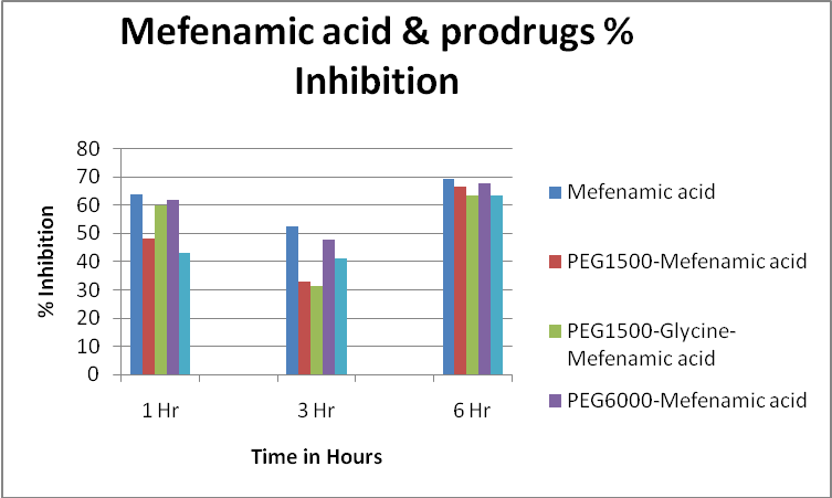Mefenamic acid drug was obtained from Hetero Drugs, Hyderabad. PEG 1500, PEG 6000, DMF (di methyl formamide), DCC (dicyclohexyl carbodiimide), DMAP (dimethyl amino pyridine), Glycine and other solvents of reagent grade were purchased from SD Fine chemicals. Animal studies were done in department of Pharmacology, Geethanjali College of Pharmacy, Keesara, Ghatkesar and it was approved by Institutional Animal Ethics Committee, Regd no: 1648/PO/a/12/CPCSEA-GCOP-IAEC-03/2013 for anti inflammatory and ulcer protecting activity.