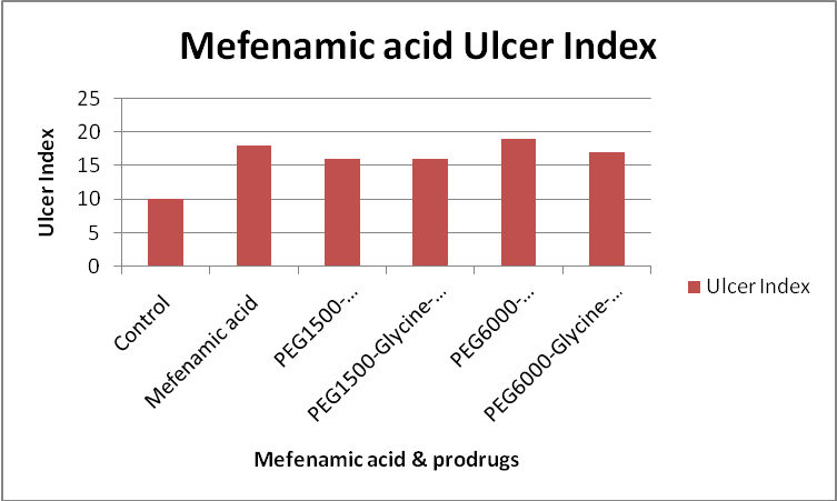 Table 3 and Fig.10 indicated ulcer protecting activity for the synthesized prodrugs. The ulcer index was measured and out of 4 prodrugs synthesized 3 of them were found to be more protecting towards ulcers than standard drug. The prodrugs which had more ulcer protecting activity are PEG 1500-mefenamic acid, PEG 1500-glycine-mefenamic acid and PEG 6000-glycine-mefenamic acid.