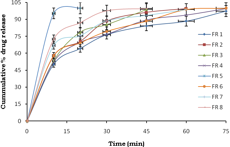 TFT of all formulations was more than 24 h. The tablets were placed in a 200 ml glass beaker containing 0.1N HCl and the time was noted until the tablets disintegrate. The time interval between the introduction of the tablet and its floating to the top of dissolution medium was taken as FLT and the duration of system floatation was taken as TFT [14].