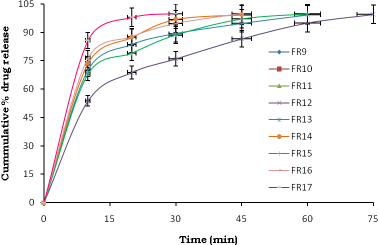 FLT of all the prepared formulations was measured by placing the tablets in a 250 ml glass beaker containing 200 ml of 0.1 N HCl. The time required for the tablet to rise to the surface and float was determined as floating lag time. This FLT was due to the time taken for the reaction between sodium bicarbonate and gastric fluids, which produced effervescence for the floating of the tablet. All the prepared formulations floated immediately after they were placed in the beaker.