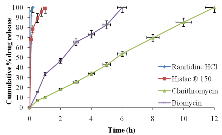 The main objective of comparing the profiles is to understand the effectiveness of the prepared BGRFT in comparison with the individual marketed tablets of ranitidine HCl (Histac®150) and clarithromycin (Biomycin 250).
