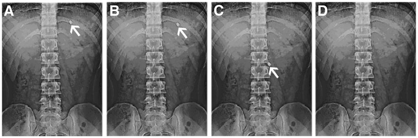 Fig. 10: X-ray photographs of gastric floating tablets of bilayer gastric retentive floating tablets containing ranitidine HCl and clarithromycin under fasted state after (a) 0.5 h (b) 2 h (c) 4 h and (d) 6 h