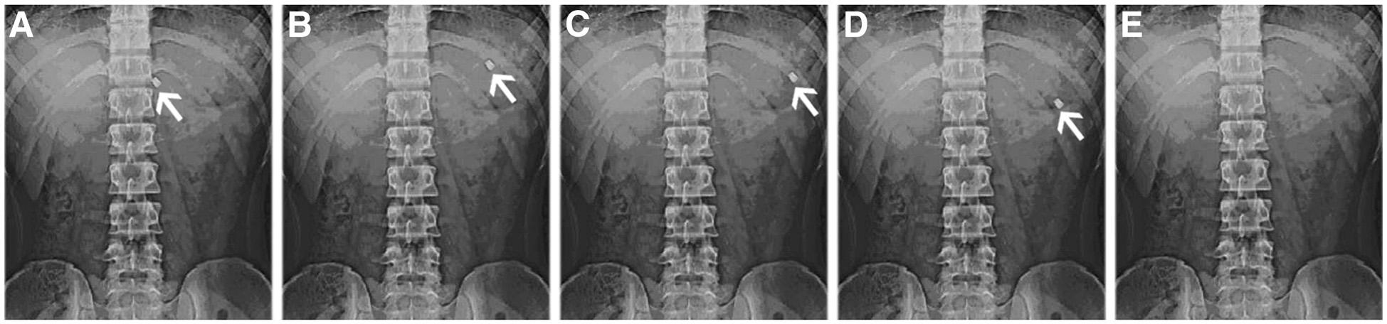 Fig. 11: X-ray photographs of gastric floating tablets of bilayer gastric retentive floating tablets containing ranitidine HCl and clarithromycin under fed state after (a) 0.5 h (b) 2 h (c) 4 h (d) 6 h and (e) 8 h