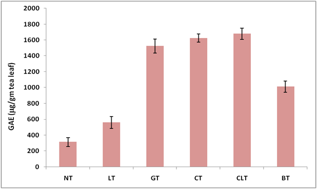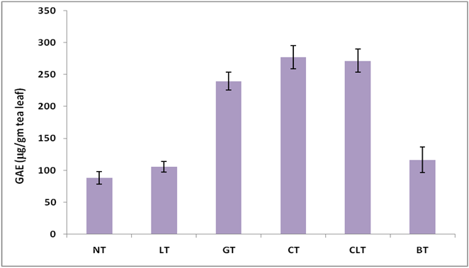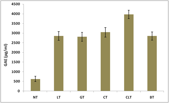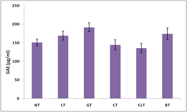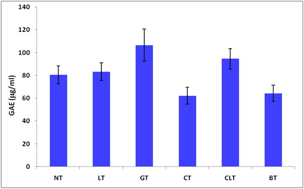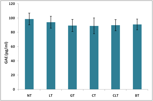 Fig. 5: Comparative polyphenolic contents of tea infusions in gallic acid equivalents (GAE) with or without added herbs. Data are mean±SEM (n=4). NT = Infusion without additive, LT = Infusion with lime juice, GT = Infusion with ginger, CT = Infusion with cardamom, CLT = Infusion with clove and BT = Infusion with basil