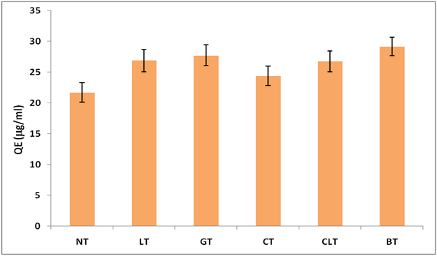 Fig. 6: Comparative flavonoid contents of tea infusions in quercetin equivalents (QE) with or without added herbs. Data are mean±SEM (n=4). NT = Infusion without additive, LT = Infusion with lime juice, GT = Infusion with ginger, CT = Infusion with cardamom, CLT = Infusion with clove and BT = Infusion with basil