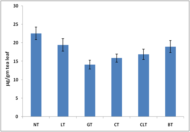 Fig. 7: Comparative tannin contents of tea infusions with or without added herbs. Data are mean±SEM (n=4). NT = Infusion without additive, LT = Infusion with lime juice, GT = Infusion with ginger, CT = Infusion with cardamom, CLT = Infusion with clove and BT = Infusion with basil
