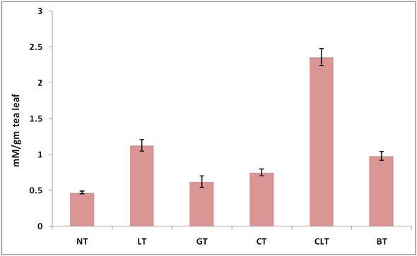 Polyphenolic contents of the tea with or without supplements more or less corroborated the results of FRAP assay (fig. 5). Clove tea showed most augmented polyphenolic content over others, which commensurate with the result of hydroxyl radical scavenging activity assay. It can be concluded that supplementation with herbs improves reducing potential as well as hydroxyl radical scavenging activities of herb-supplemented tea infusions, probably due to augmentation of different polyphenolics obtained from the additives.