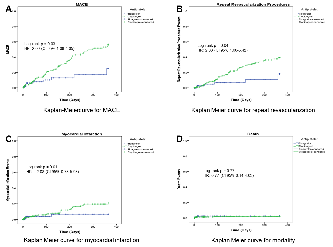Results: MACE occurred in 22.7% of the subjects. Clopidogrel had a significantly higher risk of MACE compared with ticagrelor (28.8%, vs 9.0%, hazard ratio (HR): 1.96 (95% CI 1.01 to 3.81, p=0.047). There were no significant differences in risk of repeat revascularization (20.40% vs 5.40%, HR: 2.32, 95% CI 0.99 to 5.42, p = 0.05), myocardial infarction (11.60% vs 3.60%, HR: 2.08, 95% CI, 0.73 to 5.93, p = 0.17), and death (1.60% vs 1.80%, HR: 0.77, 95% CI, 0.14 to 4.25, p = 0.77).