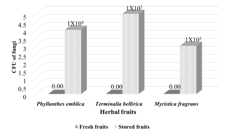 The traditionalsystem of herbal medicine has become a topic of global importanceboth as medicinal and economical[14] since they are considered as rich sources of lead compounds andquietly safe for both human use and environment-friendly [15].Considering this in the present study, assessment offungal contamination of selected fresh and stored herbal fruits was done by employing serial dilution method. Results revealed that the stored fruits were contaminated with various fungi whereas fresh fruits were found to be free of fungal contaminants.