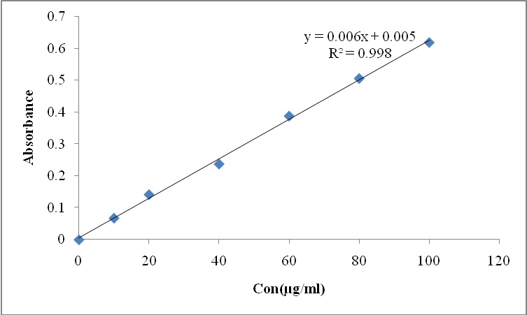The linearity of an analytical procedure is its ability to obtain test results which are directly proportional to the concentration of analyte in the sample. Calibration curve was constructed by plotting absorbance versus concentration which showed linearity over the concentration range of 10-100μg/ml as shown in figure 1 &2.