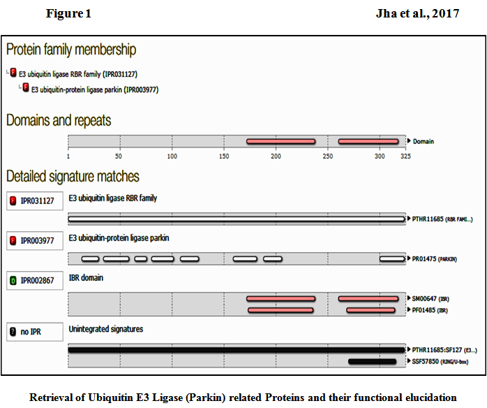 The amino acid sequence of Ubiquitin E3 Ligase Parkin with accession numbers 4I1H_A was retrieved from NCBI database and was used for homology search using Basic Local Alignment Search Tool. Protein functional elucidation was done using Interproscan server (http://www.ebi.ac.uk/interpro/search/ sequence-search/) [16].