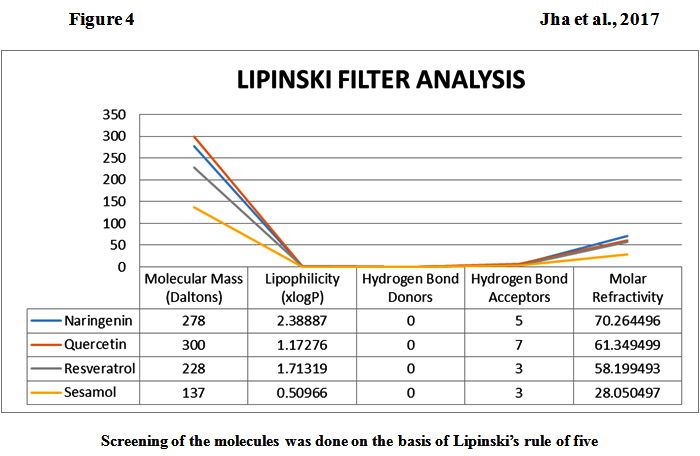 Initial screening of the molecules was done on the basis of Lipinski’s rule of five (fig. 4). Lipinski filter analysis revealed that all these molecules (Naringenin, Quercetin, Resveratrol and Sesamol) could act like a drug as they meet the criteria of Lipinski Rule of five.