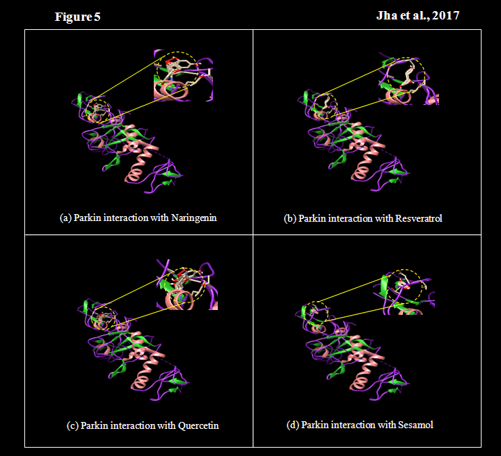 Molecular docking pattern of Parkin with screened molecules (Naringenin, Quercetin, Resveratrol and Sesamol) have been identified and depicted in (fig. 5). On the basis of docking analysis, interacting compounds with minimum binding constant and highest negative free energy of binding are most effective. Docking calculation of Parkin has been presented in (table 4).