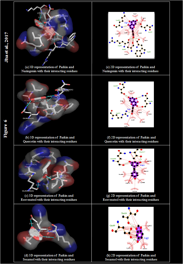 Binding site residues of Parkin interacting with Naringenin, Quercetin, Resveratrol and Sesamol were found to be the same as the residues involved in their respective catalytic sites. Interacting residues of Parkin with Naringenin, Quercetin, Resveratrol and Sesamol along with their identified catalytic sites have been shown in (table 5) and their 2D and 3D pattern of interaction is presented in (fig. 6).