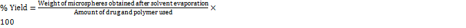 Percentage practical yield is calculated to understand the efficiency of any method, as it helps in selection of appropriate method of production. Practical yield was calculated as the weight of LP microspheres obtained from each batch in relation to the amount of drug and polymer used in the preparation [6].