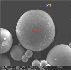 The surface morphology of the LP microspheres was studied by SEM. SEM photograph of the Formulation F5 was shown in the Fig1. Surface smoothness of the LP microspheres was increased with the increase in the polymer concentration, which was confirmed by SEM. At lower polymer conc. (1:2) surface was rough and crumpled and at higher polymer conc. (1:6) the LP microspheres with smooth surface were obtained