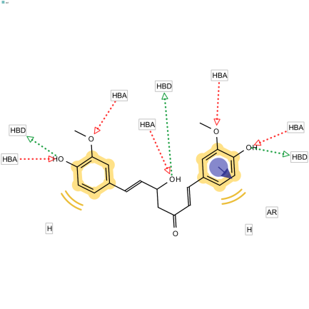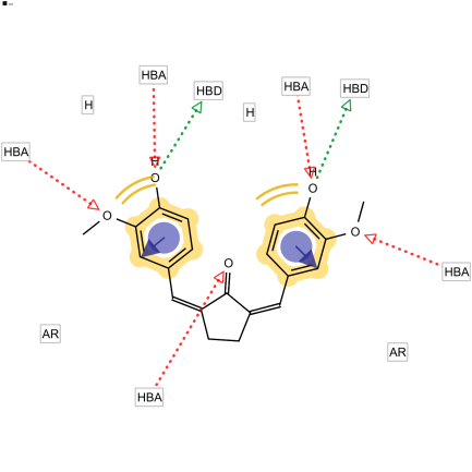 Pharmacophore group plays an important role in generating the pharmacological activity when interacting with the target protein. In pharmacophore modeling, it displays the role of steric and electornic to form the optimal interaction at a specific target, whether it is an analog or antagonist [17]. Based on the identification result, curcumin derivates possess a group that acts as pharmacophore, including aromatic rings, H-bond donor (HBD), H-bond acceptor (HBA). In general, in (fig. 3a, 3b, and 3c) curcumin and its derivates possess the same active group (analog), named the aromatic rings, HBD, and HBA. In addition, pharmacophore study reviewed the point of interaction on a particular group, then none of the same group showed pharmacophore.