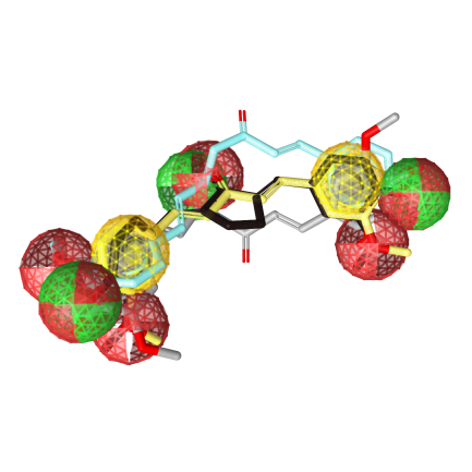 Each of ligands occupying the pharmacophore point in (fig. 3 e and f) indicate the compability level. Gamavuton and penta-gamavuton are the derivates with similar properties, and Pharmacophore-Fit Score of gamavuton is known higher than penta-gamavuton (table 1). Curcumin has 2 tautomeric forms. The enol-tautomeric is a transition from keto-tautomeric due to the electron. But the the difference of keto and enol tautomeric indicates the difference in the interaction of the target protein, which indicates that enol-tautomeric has the greater activity than the keto-tautomeric.